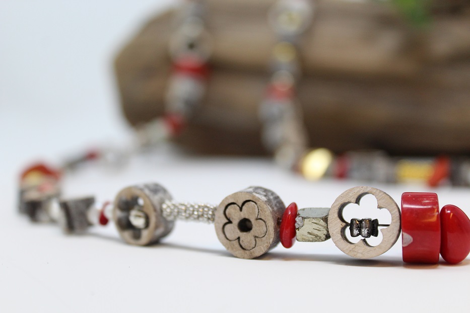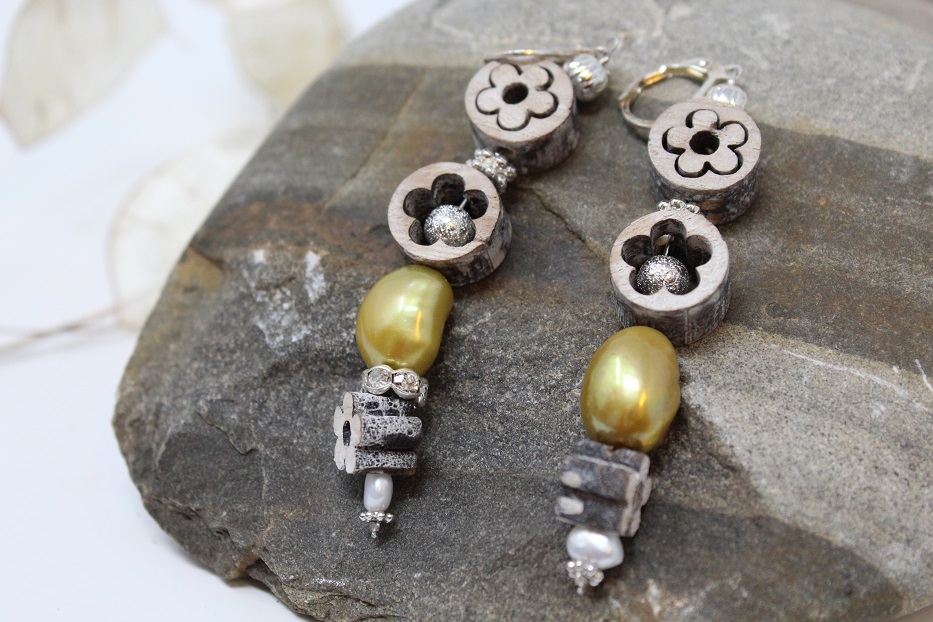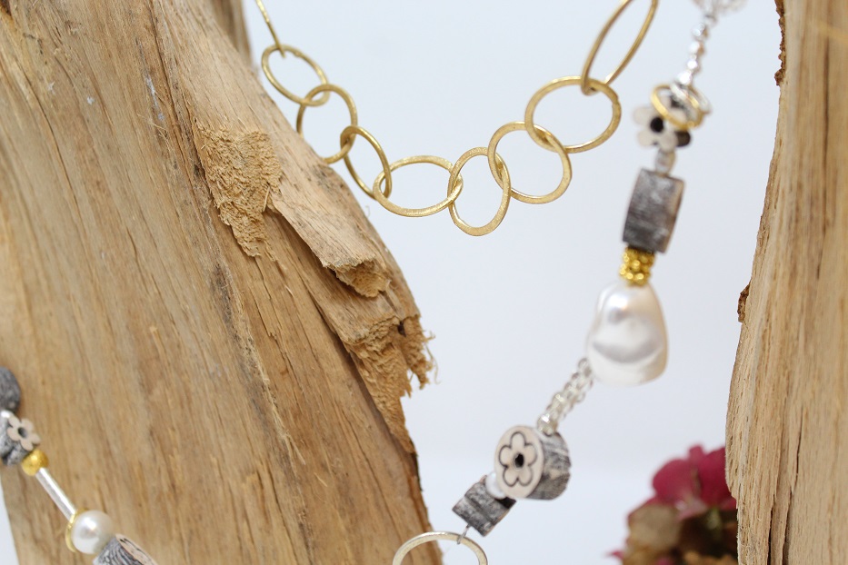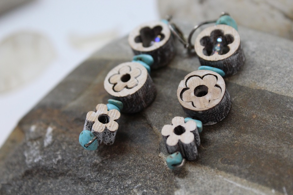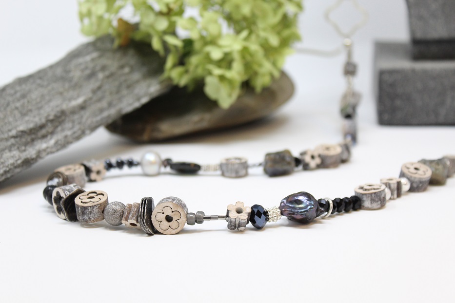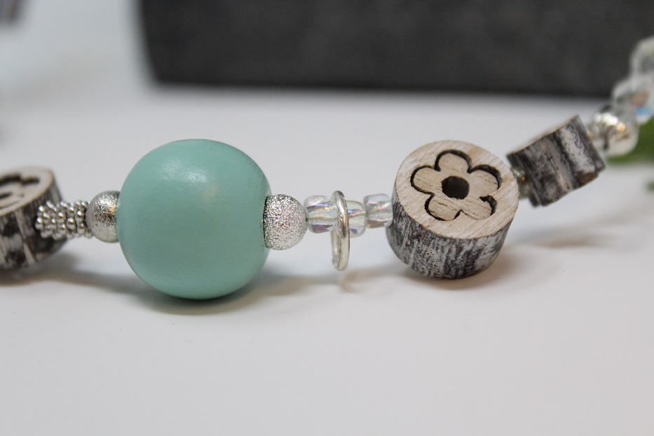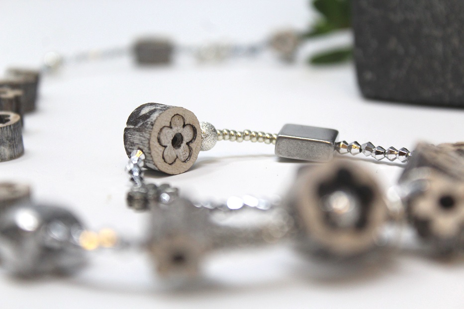 … das ist für mich leichter luftiger Schmuck, den man natürlich nicht nur im Sommer tragen kann. Ketten und Ohrringe mit leichten Holzblümchen und vielen bunten Steinen zum Beispiel.